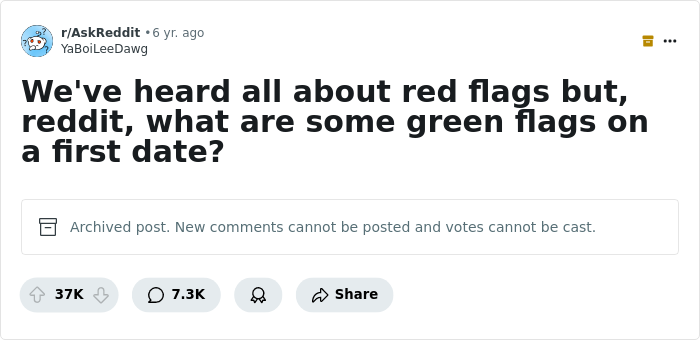 "I think I'd been browsing the Ask Reddit sub a few days in a row, and I kept seeing posts asking about red flags," Liam noted. "I thought 'enough is enough, let's hear about what you SHOULD look for on a first date.'"