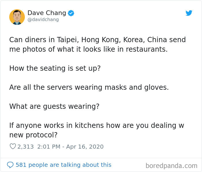 The coronavirus pandemic has changed more things than we think—especially the way people eat out in public now. Restauranteur, chef, and founder of Momofuku, David Chang, asked Twitter users from East Asia to share photos of what dining out and restaurant protocol are like now.