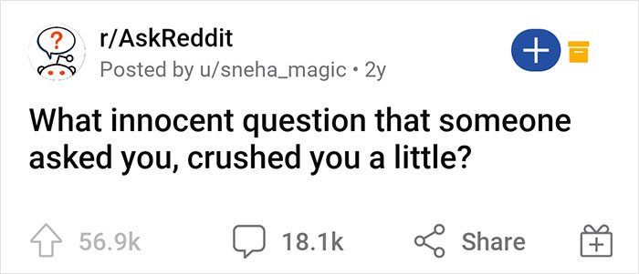 So when Redditor Sneha_magic asked people “What innocent question that someone asked you crushed you a little?” on the AskReddit community, it resonated with many people. And they shared their own emotional experiences when a single question made them very emotional, and it’s one hell of a read. It turns out, we should never take any question for granted, no matter how innocent and well-intentioned it may feel to us.