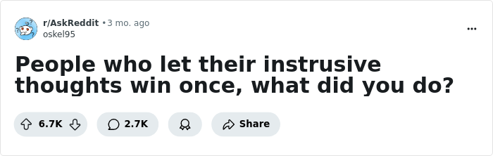 One netizen asked the internet, “People who let their intrusive thoughts win once, what did you do?”—and folks weren’t shy about sharing what happened when they caved to their cognitive chaos. Dive into this collection of our favorite responses.