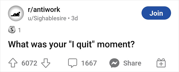 Redditor u/Sighablesire recently got curious about why people leave their workplaces. They turned to the members of the ‘Antiwork’ community, asking what was their “I quit” moment, and received plenty of answers, each more colorful than the last one. Scroll down to find them on the list below and see how many different reasons there are for employees to walk out the door.