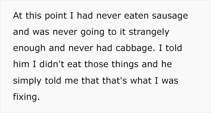 Load More Replies...As much as I feel sorry for these women, I feel so validated. You see, yesterday I have cooked cauliflower souffle after my dear father spent yet another day complaining about having to eat meat. The same man, that ordered 3 pizzas (with meat), 2 double cheeseburgers and had my grandmother make him Beef Wellington just a week before. So my stepmother buys all the ingredients, I make the souffle. With a look of disgust, he eats 3 bites, then throws the rest of it in the bin right in front of me and orders in a large McDonald's menu full of meat. This was the second time in my life that I had cooked for him. And the second time he had thrown it away. I must give it to him, the fact that he was gracious enough to try some of it, is a huge improvement. Last time, he asked for a pumpkin pie, which he didn't eat, because due to me having carried the damn pie over to his (around 130Km), the filling cracked, which made it inedible. I don't think I will be bothering again. Mind you, the only thing this guy knows how to cook is toast and scrambled eggs.