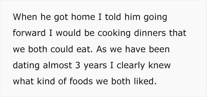 Load More Replies...Me and my ex were both trying to become chefs and had gone to culinary school for a while. We lived together for a bit over a year and I think he cooked maybe 2-3 times max. He didn't want to do chores, because they're a woman's job. He didn't even bake me a bday cake. He didn't have food waiting for me when I came home from camping. When I was so sick that all I could do was lay on the sofa all day long, didn't even have the energy to go make a sandwich, he just went to nap for 5-6 hours when he came home from his internship. I was so hungry I cried, but I had absolutely no energy to get up from the sofa. In the evening I asked him to feed me, he said no. I cried and then he angrily went to get us burgers because he didn't want to cook. I had just gone grocery shopping 2 days earlier. When he was sick he demanded I go get him a pizza across town, I said hell no, after what he had put me through just a week earlier. I made him dinner. He wouldn't eat leftovers.