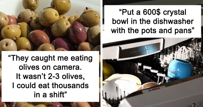 I worked in a pizza place and they caught me eating olives on camera. It wasn't 2-3 olives, I could eat like a thousands in a shift, I really don't know why and it's a time in my life I want to forget