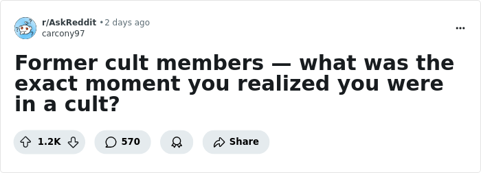 There are cults all over the world; some experts say up to 10,000 in the U.S. alone. Some members never get out. Others die trying. But fortunately, there are many who manage to escape and live to tell the tale. Someone recently asked former cult members to share the exact moment they realized they were in a cult, and hundreds of eye-opening answers followed.