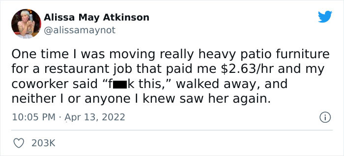 Following the trend, Twitter user Alissa May Atkinson from Brooklyn, New York shared a story of how “One time I was moving really heavy patio furniture for a restaurant job that paid me $2.63/hr and my coworker said '**** this,' walked away, and neither I or anyone I knew saw her again.” The tweet amassed 203K likes, resonating with many people on the platform.