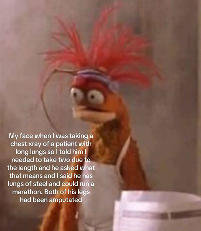 My face when I was taking a chest xray of a patient with long lungs so I told him I needed to take two due to the length and he asked what that means and I said he has lungs of steel and could run a marathon. Both of his legs had been amputated.