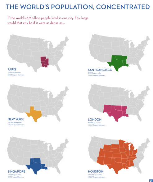 If all the humans alive right now lived in the same density per square mile as New York City, we could all live in the state of Texas.