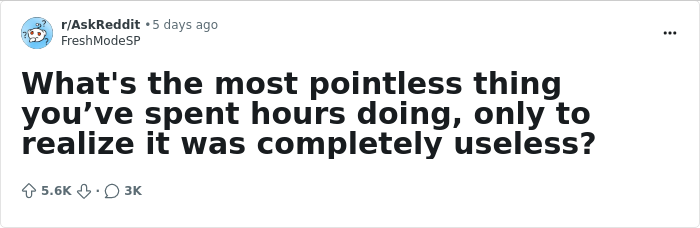 A few days ago, a thread appeared in the AskReddit community, which as of today boasts 5.6K upvotes and over 3K various comments. The thread's starter, the user u/FreshModeSP, asked readers: "What's the most pointless thing you've spent hours doing, only to realize it was completely useless?"