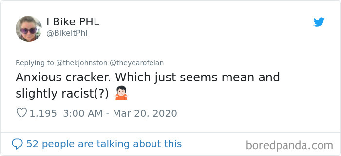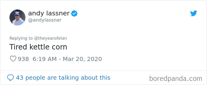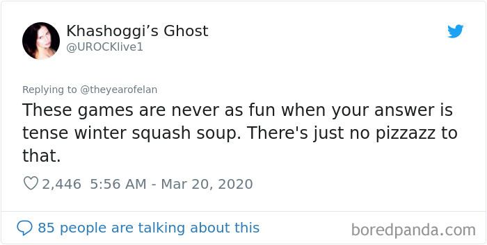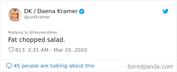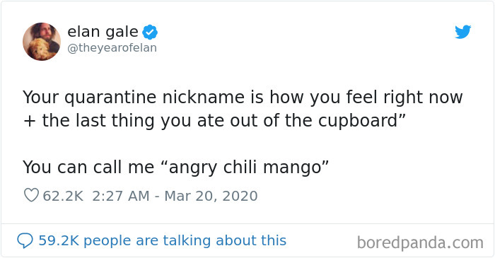 Twitter is on fire! With so many people sitting at home and having a lot of time on their hands, many are turning to Twitter for some light-hearted entertainment and humor to take their minds off the threatening virus. So when TV producer Elan Gale (best known for working on The Bachelor and The Bachelorette) suggested that people share their "quarantine nicknames," hilarity ensued. "Your quarantine nickname is how you feel right now + the last thing you ate out of the cupboard. You can call me 'angry chili mango,'" he tweets, receiving tons of silly but amusing responses. Scroll down below to read all of the nicknames and don't forget to share yours in the comment section!