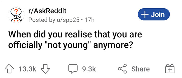 Bored Panda reached out to the author of this thread, Redditor Spp25, who said the idea to ask people “when did you realize that you are officially 'not young' anymore?” came while he was busy doing chores. “Basically I was doing some cleaning and I dropped something and it broke,” Spp25 recounted.