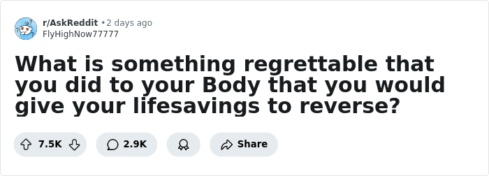 People online detail the things they now regret putting their bodies through at some point in life. So get comfortable as you scroll through, remember to stand at for around fifteen minutes once an hour, upvote your favorites and be sure to share your thoughts in the comments below.