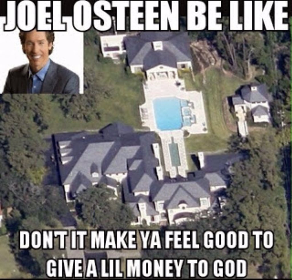 Same with Joel Osteen. He is super rich and it’s all because he scams people. He doesn’t even preach from the Bible. He only talks about being happy and “live your best life now”. You literally will have your best life in heaven, not on earth.
