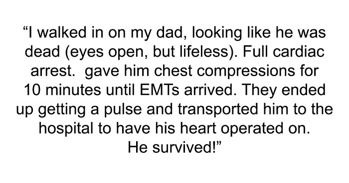I walked in on my dad, looking like he was dead (eyes open, but lifeless) He was suffering a full cardiac arrest. I called 911 and gave him chest compressions for 10 minutes until EMTs arrived. When they got there they told me his heart and lungs had stopped (full cardiac arrest) and they were struggling getting a pulse. I thought no way this is it and he did end up getting a pulse, being transported to the hospital and having his heart operated on. He survived!