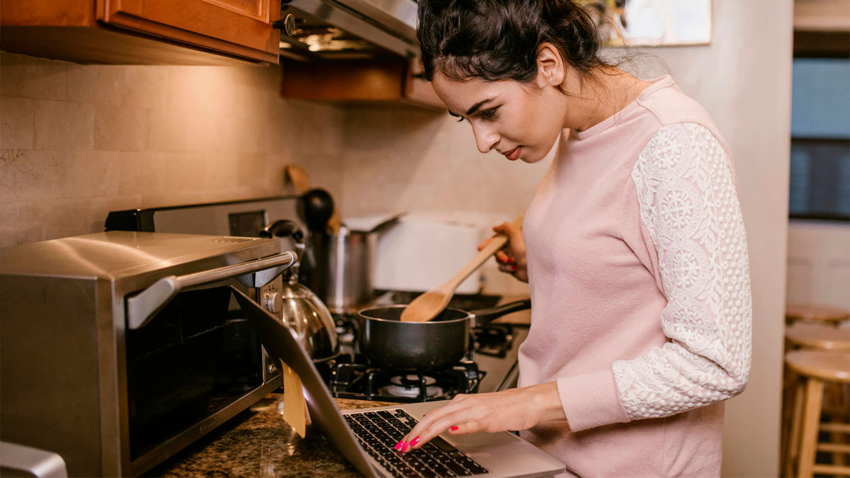 Young woman using laptop in kitchen while cooking, illustrating helpful life hacks for everyday tasks and efficiency. When looking at recipes online, click the print link. This cuts out the unnecessary backstory and random musings. You can also save the recipe as a PDF to your computer or even just the link to the printable version.