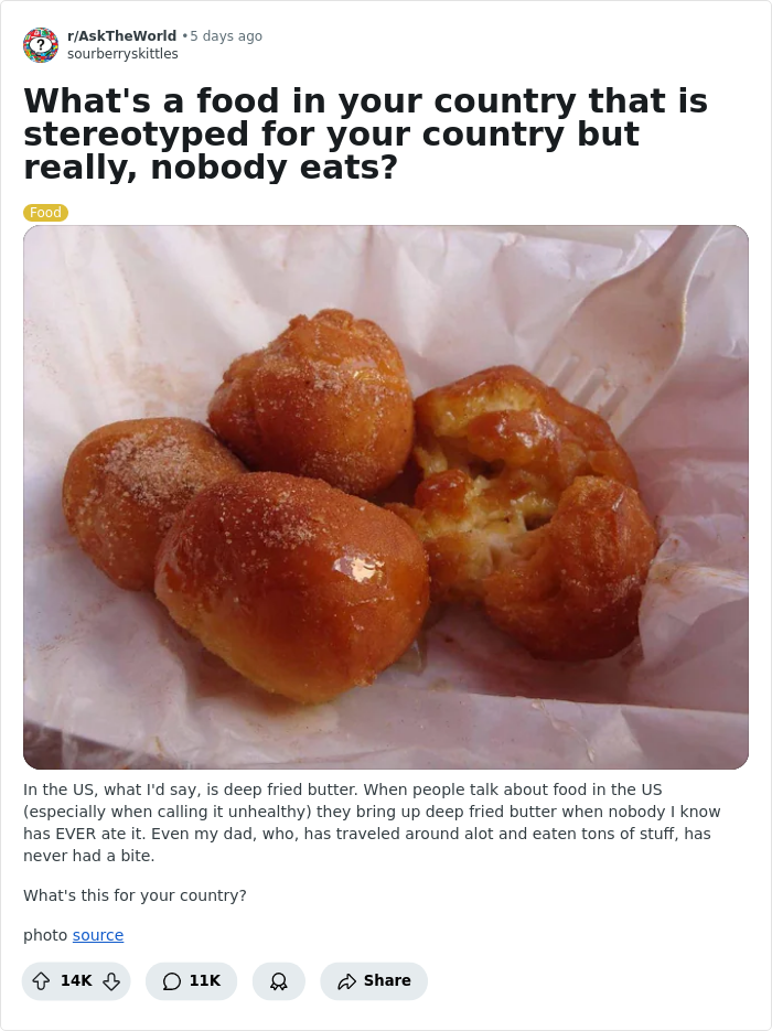 Someone asked “What's a food in your country that is stereotyped for your country but really, nobody eats?” and people from around the world shared their best examples. So get comfortable as you scroll through, bring a snack, upvote your favorites and be sure to share your thoughts in the comments down below.
