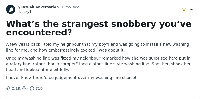 Someone asked “What’s the strangest snobbery you’ve encountered?” and netizens shared their most bizarre stories. So get comfortable as you scroll through, upvote the most truly unhinged examples and be sure to add your own tales to the comments section down below.