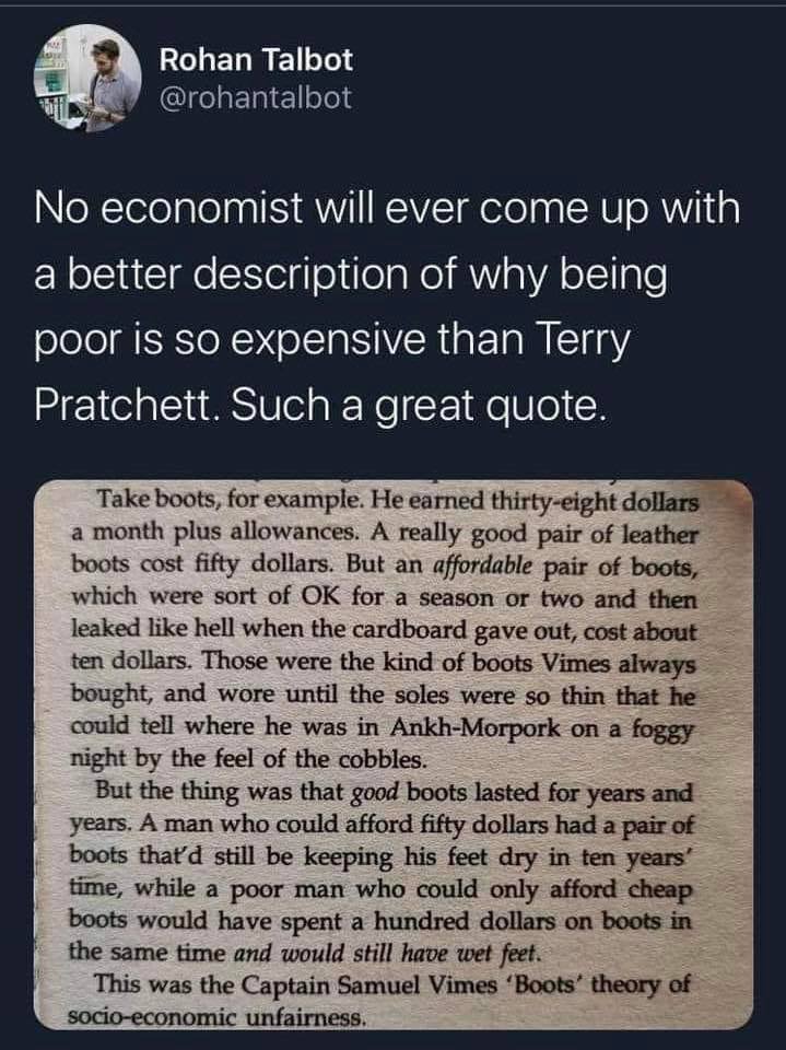 For more see genius Terry Pratchetts character cpt. Sam Vimes ´Boots' theory of socioeconomic unfairness.´