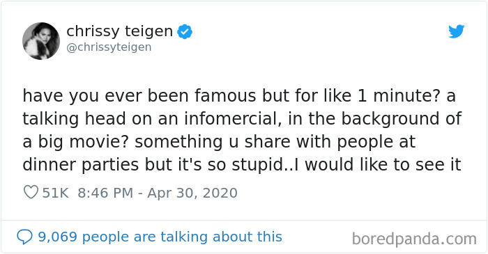 But thanks to Chrissy Teigen, the internet has laid it all out on the table for everyone to cringe upon. The 34-year-old star asked people on Twitter to share their 1 minute of fame stories that “u share with people at dinner parties but it’s so stupid.” 51K likes and 1.9K retweets later, the answers are in, and trust me—it’s gonna be a roller-coaster ride you didn’t know you needed.