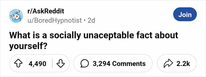 Inspired by user u/BoredHypnotist, the anonymous members of the r/AskReddit community revealed the most ‘socially unacceptable’ facts about themselves. These are things that anyone would have a hard time mentioning in public. Scroll down to see what kinds of secrets some folks have. It’s also a reminder for all of us to learn to be less judgmental and kinder to each other.