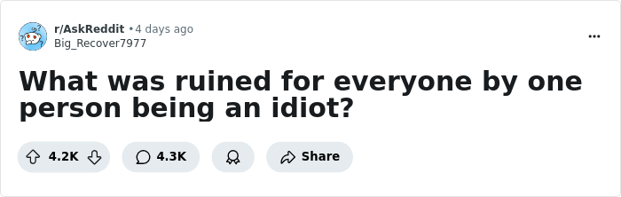 A few days ago, a thread appeared in the AskReddit community, whose author, user u/Big_Recover7977, asked netizens: "What was ruined for everyone by one person being an idiot?" Well, it's not that the culprits of all the problems in the stories told by the people who were among more than 4.4K comments were absolutely idiots...