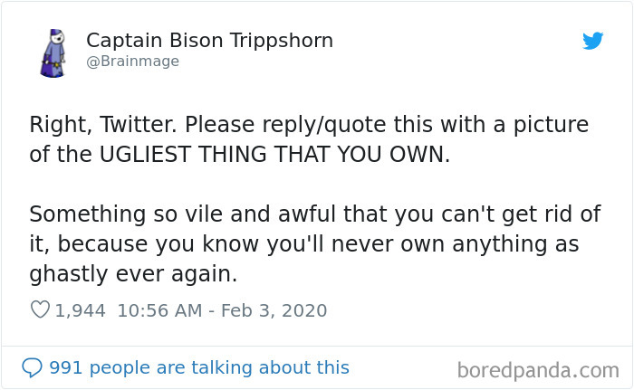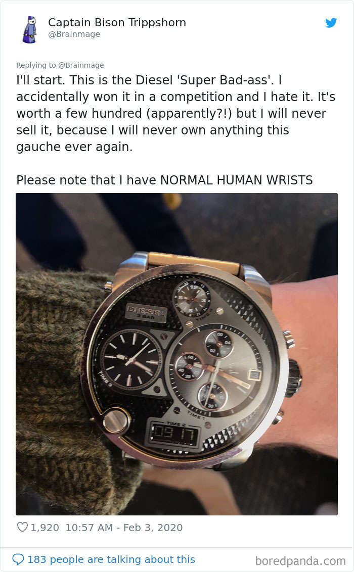 Far from everything we have at home is gorgeous and aesthetic. But have you ever wondered what the ugliest thing that you own is? Actor, comedian, writer, voiceover artist, and self-proclaimed wizard Guy Kelly (aka Brainmage) shared a photo of his chunky Diesel watch and then invited other Twitter users to share photos of the weird things they own in a viral thread.