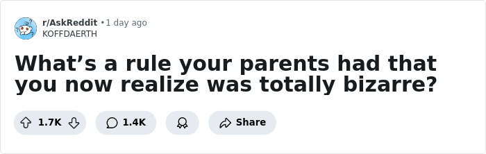 But not everyone had it that simple. One Redditor asked people to share the bizarre rules they grew up with, and the replies did not disappoint. Some are downright hilarious, others so strange they feel like fever dreams, and a few practically beg to be unpacked in therapy. Keep scrolling to see for yourself.