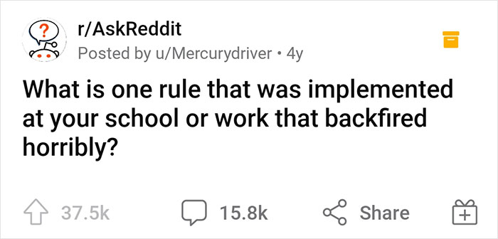 But, as one Reddit thread shows, this is often easier said than done. Started by user Mercurydriver, it asked platform users the question: "What is one rule that was implemented at your school or work that backfired horribly?" And they gave plenty of juicy answers.