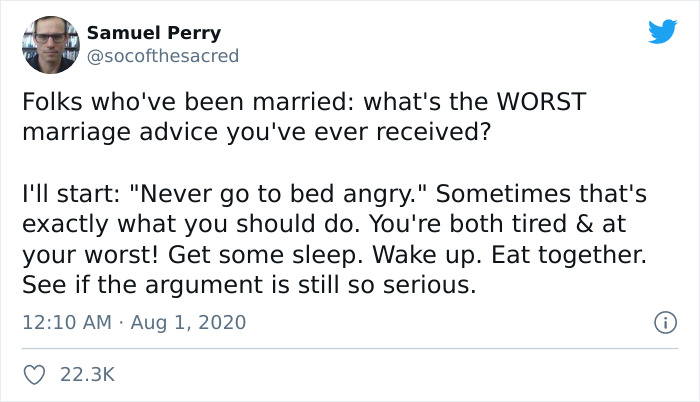 Unfortunately, a lot of that advice is absolutely bogus, as sociologist Samuel Perry from the University of Oklahoma drew attention to on Twitter. The scholar asked social media users to share the very worst marriage advice they’ve ever gotten and kicked things off with an example of his own about how couples should supposedly not go to bed angry.
