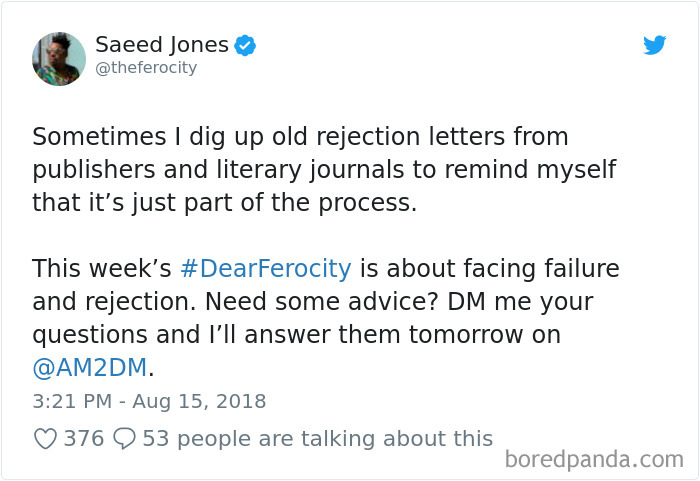 Author Saeed Jones started the initiative, saying "Sometimes I dig up old rejection letters from publishers and literary journals to remind myself that it’s just part of the process." He added the hashtag and others quickly joined him.