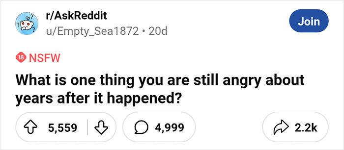 So, it's natural to hold some kind of grudge – apparently, many people do. One person was curious to know what resentments people have, so they asked: "What is one thing you are still angry about years after it happened?" Well, the statistic above seems to be true because over five thousand people came with receipts of things they still can't get over.