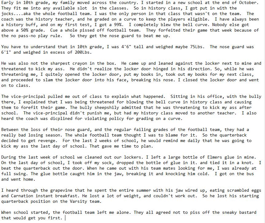 Not me, but my son. Son was in 8th grade and having a hard time. He was diagnosed borderline autistic, severe ADD, & otherstuff. That's a lot. We're fighting for Sp.Ed , but he had pretty much decided he hated this school, the VP (who we later got fired), most of his teachers (who weren't helping).He got bullied & lived with it. But there was 1 kid that was so bad, he wasn't allowed to sit near my son. One day, the teacher left the room (they weren't to be left alone together) & this kid gets up, & heads right to him. Son told him to leave several times, but this boy kept taunting, hitting & throwing things. He lost his temper when the kid talked about me. He went after him, chased him down the hall & threw him headfirst into lockers. I said he wouldn't be punished at home since they failed to do their job & he was defending his family. VP was livid. Saw the kid a few years ago, 25yo looked strung out. He wouldn't look at son. Karma is a b***h