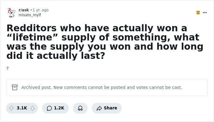 While it might not seem like it happens often, quite a few people have been lucky enough to win a lifetime supply of something. Many of them shared their stories on a thread on Reddit after one user asked them about what it was that they won and how long exactly their ‘lifetime supply’ lasted. If you’re curious, too, about what the winners were provided with (or at least were promised to be provided with) for life, scroll down to find their stories on the list below and make sure to upvote the ones you liked most!