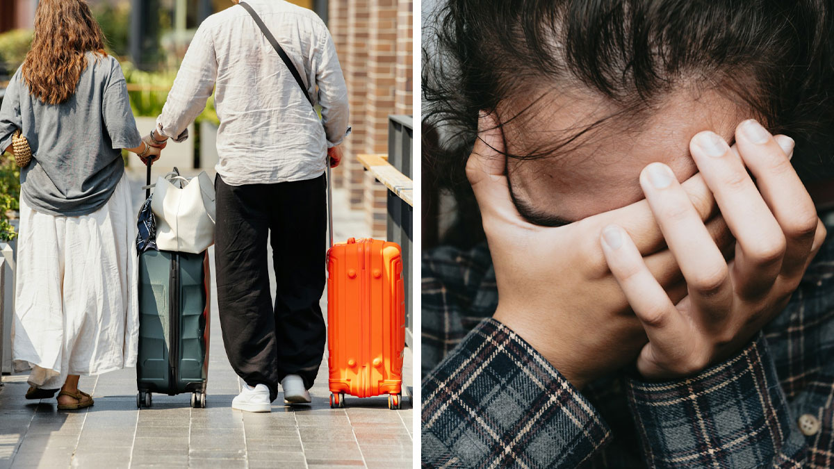 Couple walking with luggage on family vacation, highlighting emotional stress and reactions during travel.