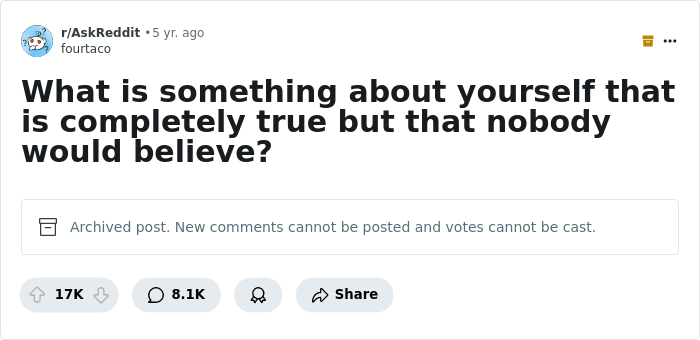 A curious person once asked, "What is something about yourself that is completely true but that nobody would believe?" and netizens didn't hold back. The question clocked over 8,000 comments, as people shared the things that "allegedly" happened to them. One person even told how the legendary Nelson Mandela walked them to school on a remote island in the Indian Ocean...