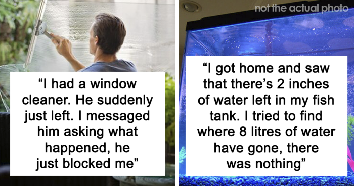 Okay so I get home from a shift i left at 7 in the morning ,and the fish tank was fine I get back at like 4 ish open the door my partner is out just me in the house , I hear a rumbling like plastic being rattled I look round the house trying to find the noise look at the fish tank and there is like 2 inches of water in there fish are nearly dead ( don't worry they survived) im like what the actual f**k where has my fish tank water gone ? Note there are no tubes or anything like that coming out the tank it was completely empty no cracks in the plastic nothing phone my missus in a panic she has no idea I search the around the stand and the floor nothing nothing . This freaks me out I quickly pour a few cups of water in , I didn't want to shock my fish with freezing cold water just enough for them to swim and breathe . I searched for a hour trying to find where 8 litres of water have gone no trace no spill no damp no puddles . I spent the next hour saying if there some one in here I will hurt you and call the police to this day mr and my missus get freaked out thinking about it . Where did it go