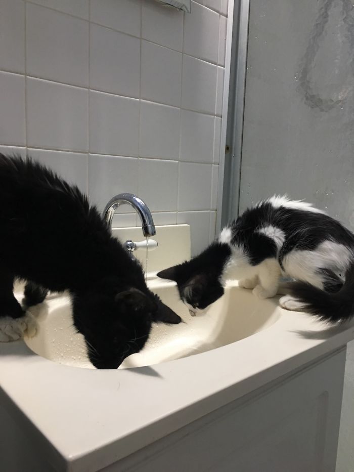 Tuesday morning. My cat Thunder on the left. 14 years old. And the new kitten Junior just over 4 months. Thunder didn’t like any other cats. Stayed in the dining room. She came with me when I moved in with my husband 13 years ago. She came upstairs that morning to drink from the bathroom sink. Like she did. When I lived alone with her. The kitten joined her. Learned a new thing.