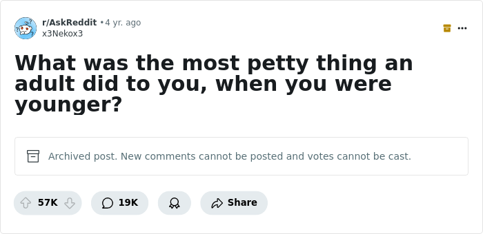 To find out how this conversation started in the first place, we reached out to the Reddit user who posed the question, "What was the most petty thing an adult did to you when you were younger?”