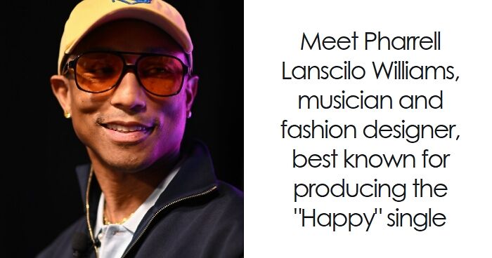 His breakout arrived with the 2013 global sensation “Happy,” which topped charts worldwide and became one of the best-selling singles of all time. Williams frequently sports bold, statement-making eyewear.