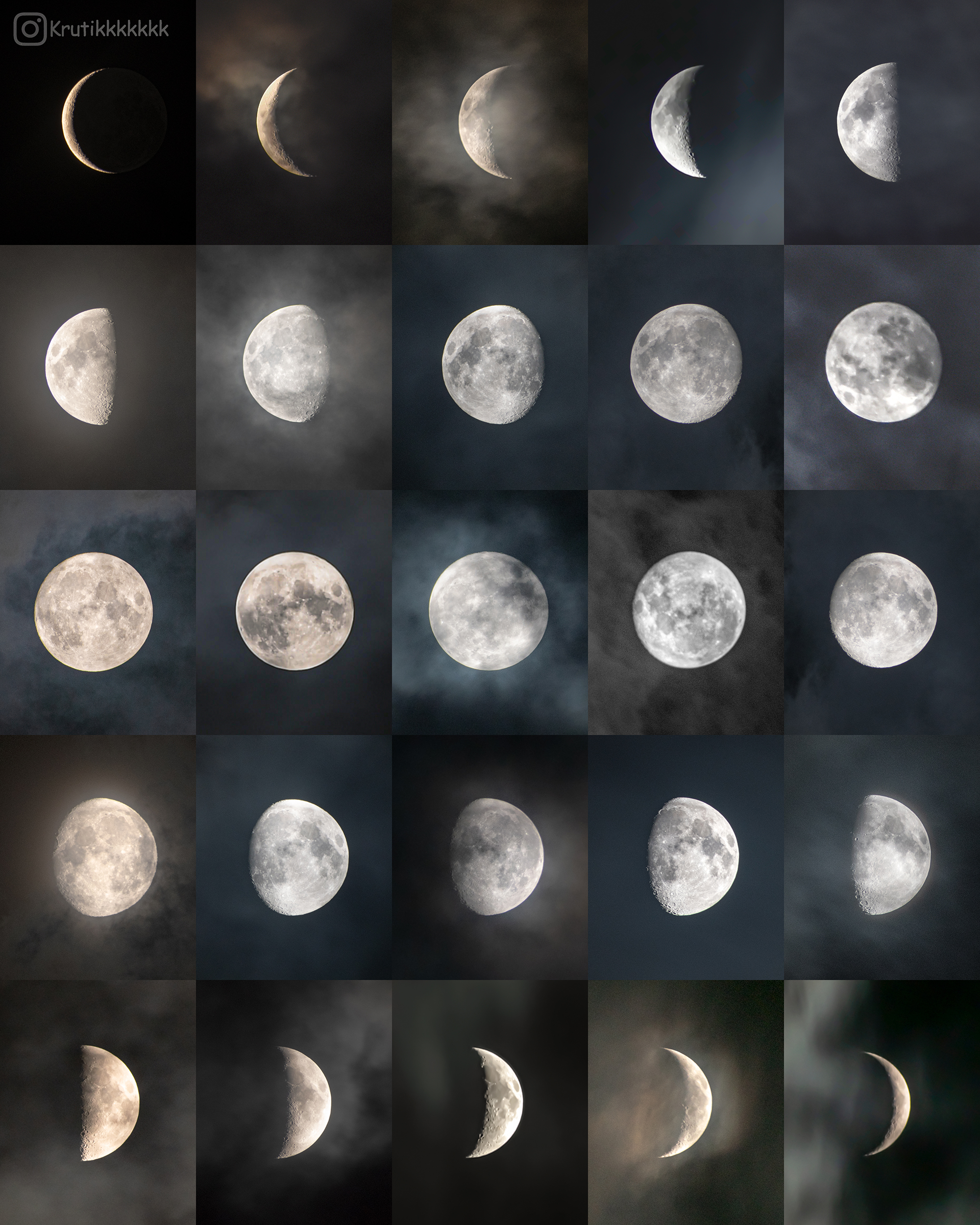 A Year ago I used to sit alone on terrace watching Moon and wonder if I could capture it with clouds in single shot and that curiosity moved me to spend nights to get better in it and this year decided to make a Moon phase cycle and It took me five months to accomplish this.