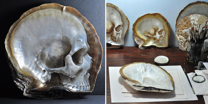 New Jersey-based Filipino artist Gregory Halili is perfect proof of the idea that, with a bit of creativity and a healthy dose of talent and practice, beautiful art can be made out of some of the most unexpected objects. In his hands, these mother-of-pearl shells become delicate bas-relief skull carvings with subtle oil-paint accents.