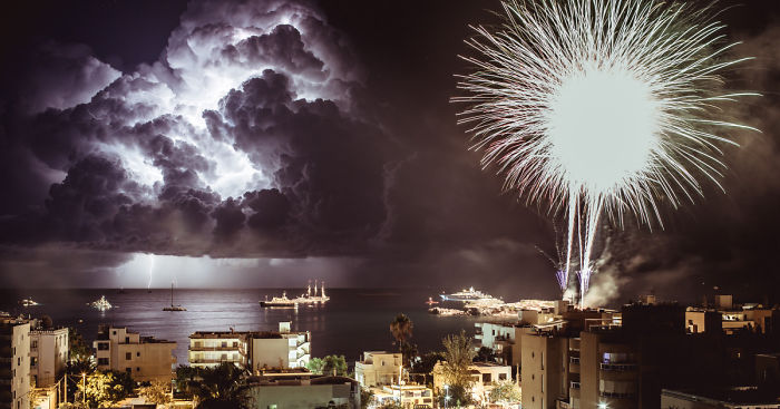 Justin Gardner is a professional photographer, specializing in event, still life and landscape photography. He captured the moment that Mother Nature upstaged a fireworks display with her very own “lightening” show. The Ibiza-based photographer captured this spectacular “man vs nature” moment, from his roof terrace in Figueretas during the Assumption of Mary Bank Holiday celebrations.