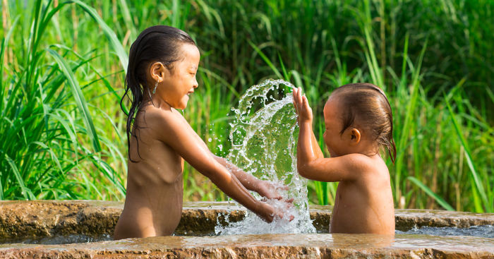 2 sisters playing in a bath on the road