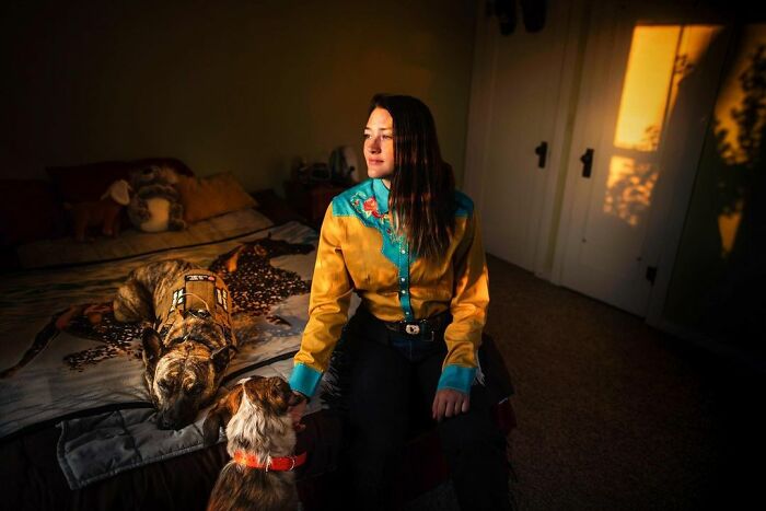 She’s a cow grl ! Those dogs are her corral dogs !! And I love that shirt !