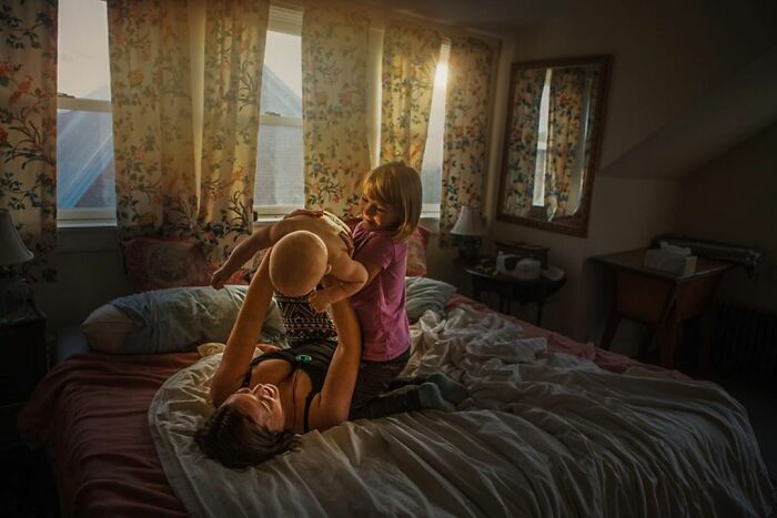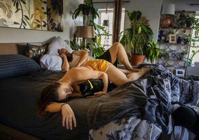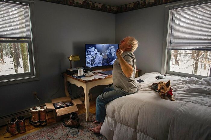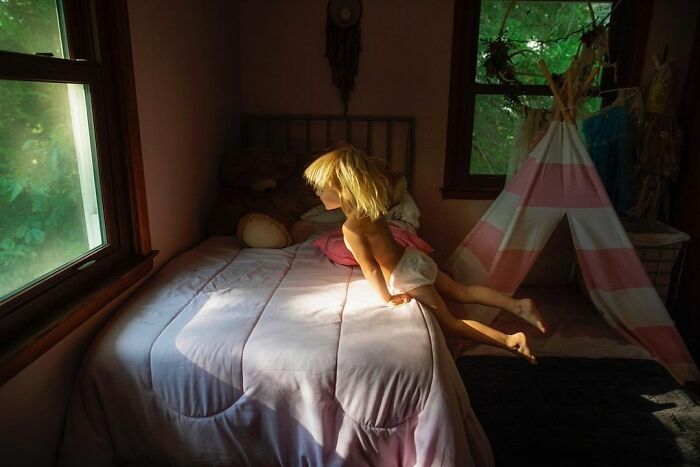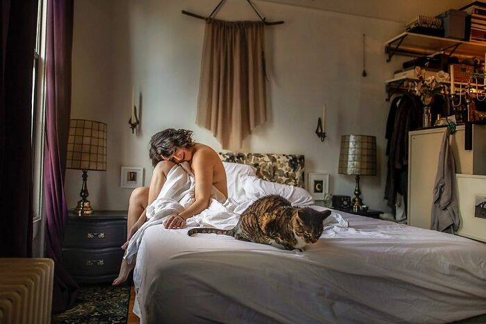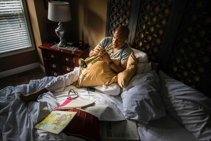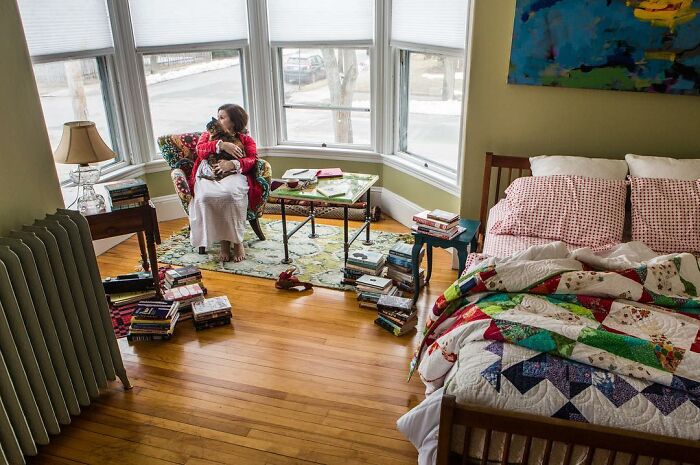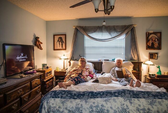 Barbara shared with Bored Panda that the idea of photographing people in their rooms was born in 2016: "I woke up early one morning and looked out my bedroom window to look at my garden. When I turned around I saw my husband wrapped up in blankets, bathed in beautiful golden light with his snore mask on. I had to chuckle at the dichotomy of beauty and humor. Then I thought about how I would complete the scene. It was then I realized that what we have on our side tables and around the room tells a distinct and personal story."