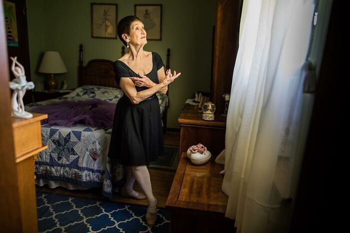 Former ballerina (I'm guessing) still beautiful surrounding herself with beauty. Lots of upvotes.