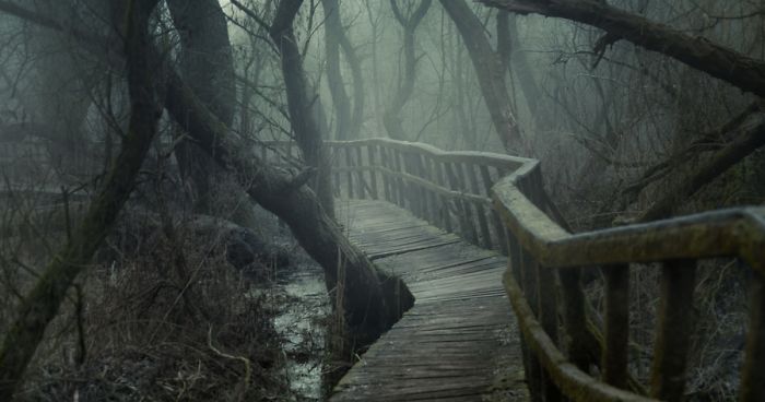 Soon the surroundings turned dark and the fog got thicker. It was completely silent and the only sound I could hear was the squeaking of putrid wooden slats.
