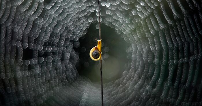 What a feat - you were able to capture the light, soft-focus detail of the web, and that we can see the gorgeous little snail as both transparent and also see its tiny markings (up near the shell opening).
