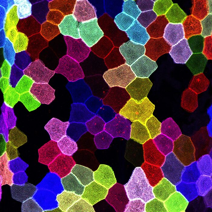 "Nerve network within the skin of zebrafish (Danio rerio) scales. Different colors depict the different planes and depth of the nerves in individual scales."