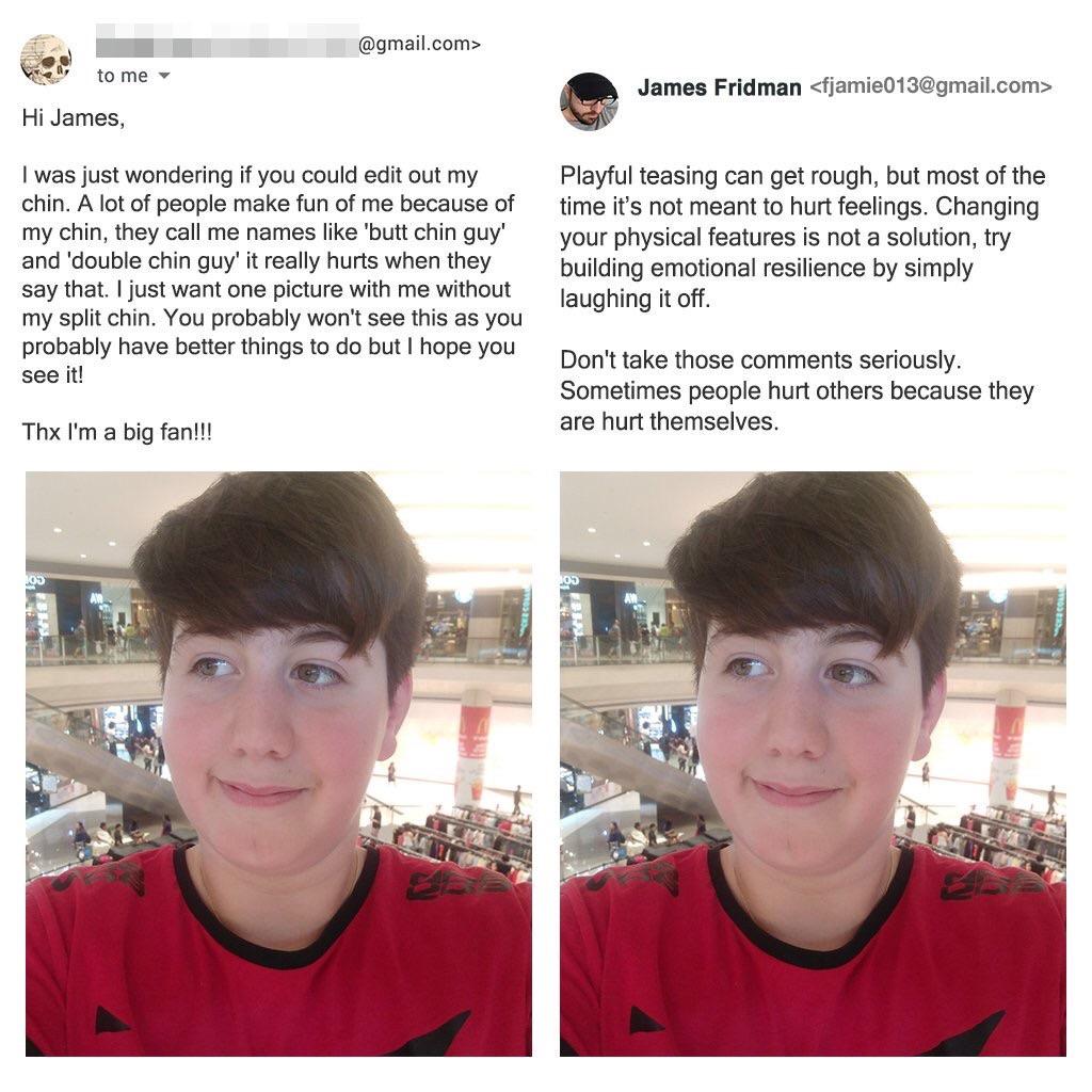 James has become notorious for taking photo editing requests far, far too literally. Remember that episode from ‘The Simpsons’ where the family find and use a monkey’s paw to grant wishes, but they’ve all got twists to them? Well, that’s exactly what it’s like asking James for help! He takes requests very literally and it leads to all kinds of shenanigans. Of course, it’s all done with a smile and for the sake of some great humor (hey, laughter’s really good for lowering your stress levels).